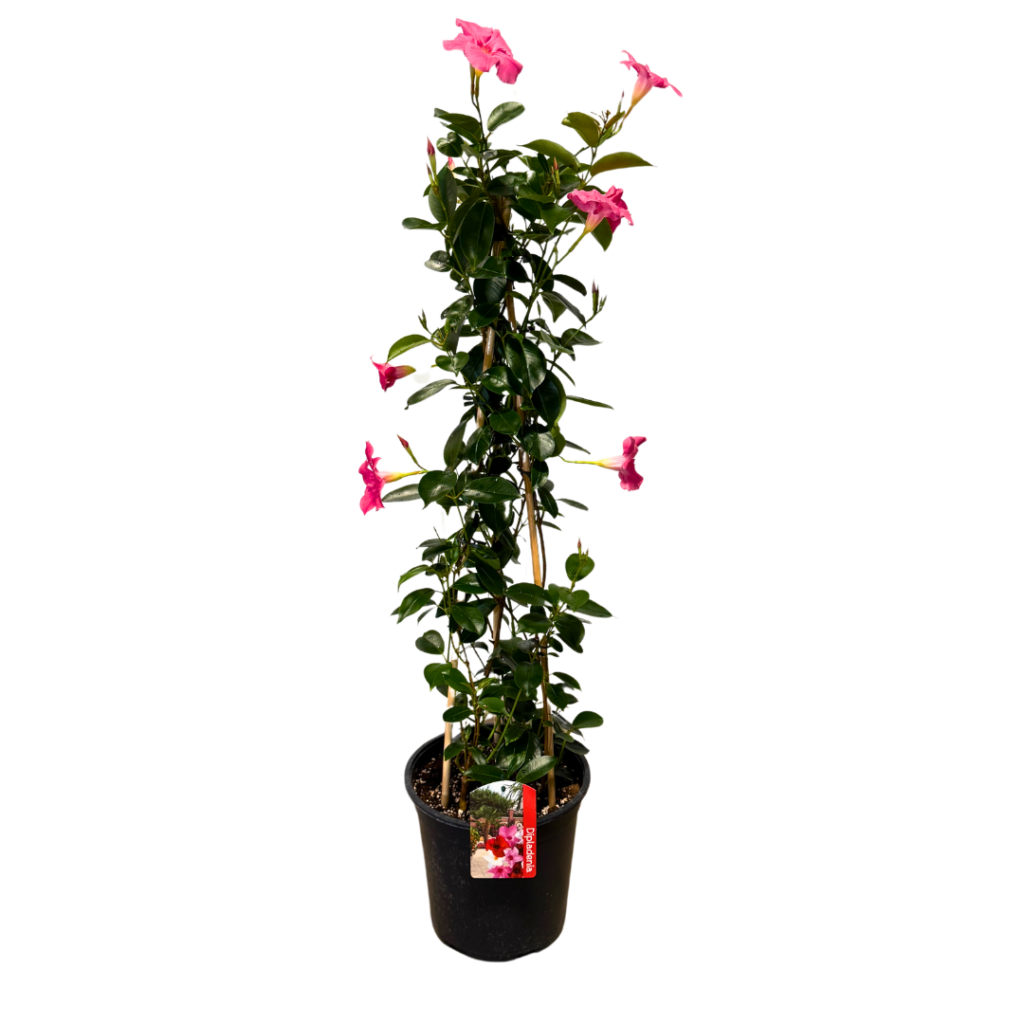 When placed in a sunny or partly shaded spot, and pruning the long-grown shoots, it will flower all summer long. Keep the compost moist, without overwatering, and fertilize every two weeks with a standard fertilizer. Remove faded flowers and seed pods. The Dipladenia is not winter hardy.